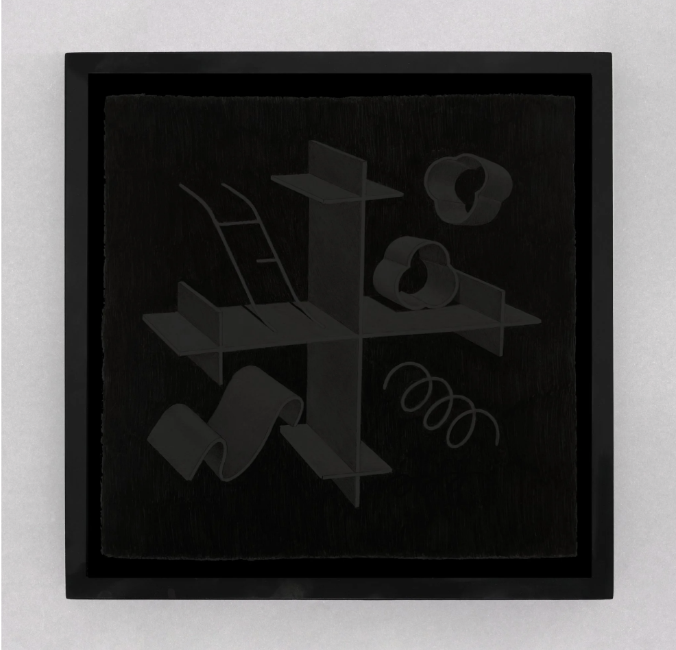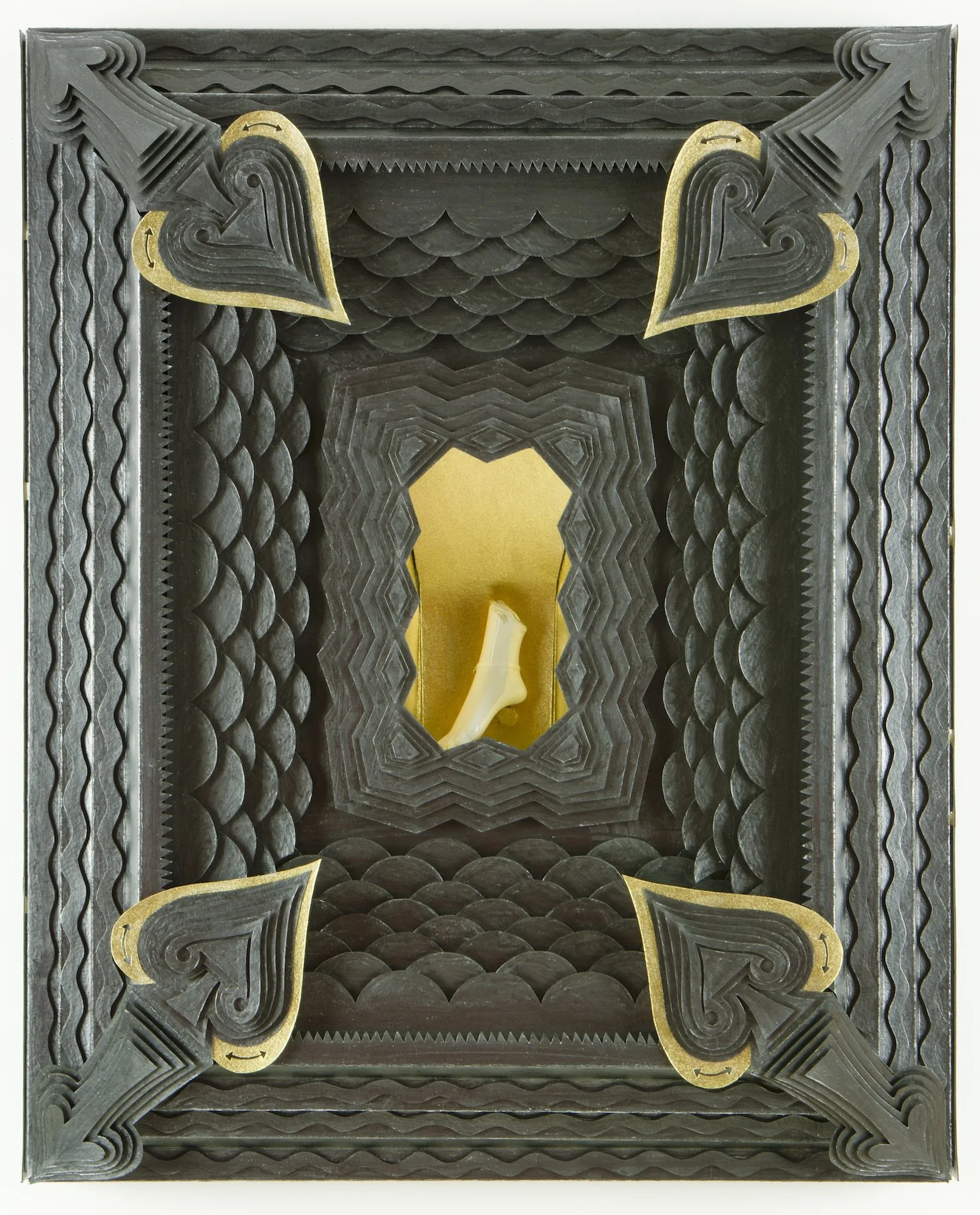 graphite, metallic gouache, ink, found object and string on paper and wood construction